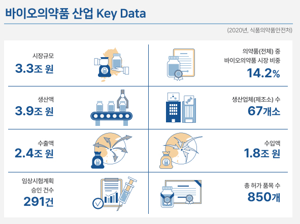 바이오의약품 생산액은 2016년 2조원을 돌파한 이후 2020년 3조 9000억원으로 2009년에서 1조 3000억원보다 3배 성장했으며, 수출액은 2조 4000억원으로 같은기간 4배 늘었다.