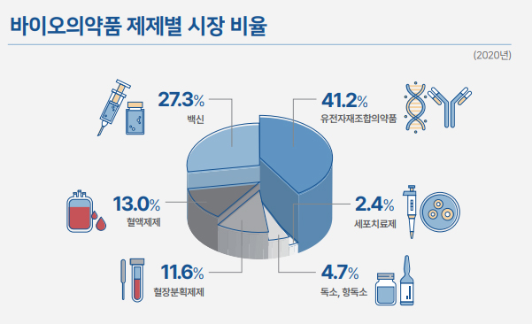 이에 따른 시장 비율을 보면 △유전자재조합의약품이 41.2%를 차지하고 있으며 △백신이 27.3%, 혈액제제 13.0%, △혈장분획제제 11.6%, △독소 4.7%, △세포치료제 2.4%로 나타났다.