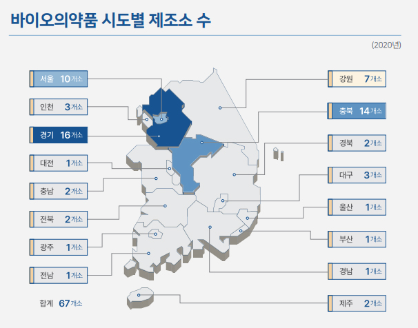 바이오의약품 제조소는 전국 67개소가 있으며 경기도에 가장 많은 16곳이 있었다. 이어 충북에 14개소, 서울 10개소, 강원 7개소 순으로 집계됐다.