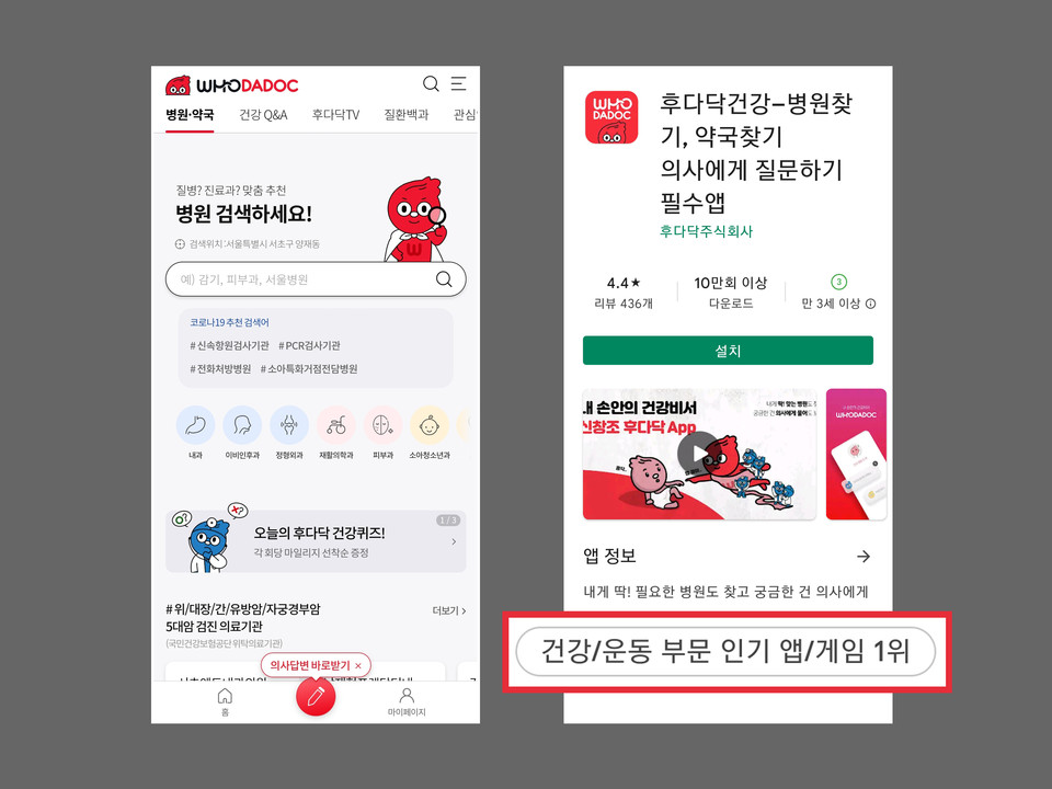 종합 헬스케어 플랫폼 '후다닥 건강'이 구글 플레이스토어 건강·운동 부문 앱 인기 순위 1위에 올랐다. 회사는 21일 후다닥 건강이 4월 넷째 주 기준 구글 플레이스토어 건강·운동 부문 실시간 인기 앱 1위를 비롯해 전체 앱 인기 순위에서도 5위를 기록하고 있다고 밝혔다.