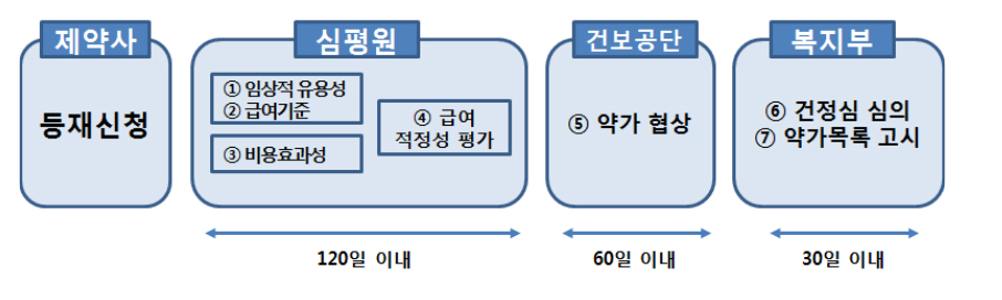 현재 신약 등재일정을 보면 제약사가 급여결정 신청한 후 심평원에서 임상적 유용성과 비용효과성, 급여적정성 등을 평가하는데 120일이 소요됩니다.
