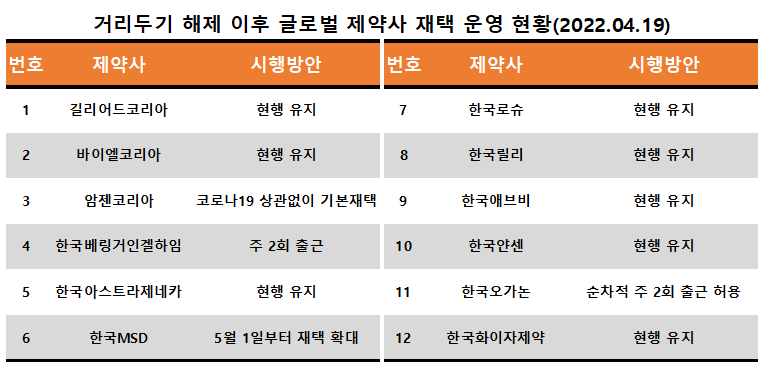 정부가 4월 18일부터 사회적 거리두기를 해제했지만 국내 다국적 제약사(MNC)들은 재택 위주의 근무 형태를 대부분 유지하며 새로운 정부 방역지침에 따른 내부지침을 마련 중인 것으로 확인됐습니다.
