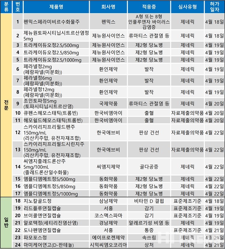 의약품 24 품목이 지난 주 식품의약품안전처 품목허가를 받았다. 전문의약품은 17건, 일반의약품은 7건이었다. 허가된 전문의약품들의 적응증은 류마티스 관절염, 제2형당뇨병, 발작, 출혈 등 다양했다.