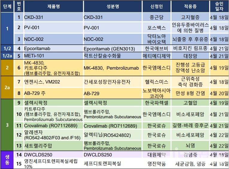 임상시험계획은 총 15건이 승인됐다. 임상 1상 3건, 1/2상 1건, 1/2a상 1건, 2상 1건, 2a상 2건, 3상 5건, 생물학적동등성 2건 등이었다.