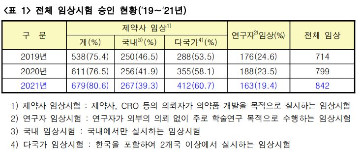 '2021년 의약품 임상시험 승인 현황'에 따르면, 전체 임상시험 승인 건수는 △2019년 714건 △2020년 799건 △2021년 842건으로 증가해왔다.