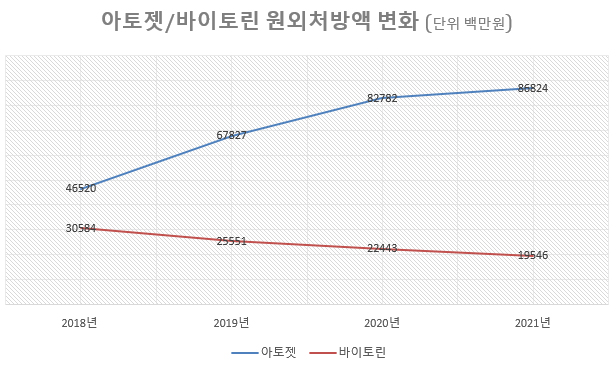 2016년 247억원을 기록한 아토젯의 원외처방액은 지속적으로 증가했다. 2018년에는 465억원에서 2019년 678억원, 2020년 827억원, 지난해 868억원으로 늘었다.