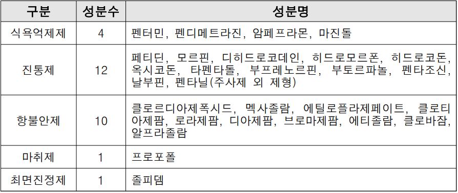 해당 효능군 및 성분은 △식욕억제제 4성분(펜터민, 펜디메트라진, 암페프라몬, 마진돌) △진통제 12성분(페티딘, 모르핀, 디히드로코데인, 히드로모르폰, 히드로코돈, 옥시코돈, 타펜타돌, 부프레노르핀, 부토르파놀, 펜타조신, 날부핀, 펜타닐(주사제 외 제형)) △항불안제 10성분(클로르디아제폭시드, 멕사졸람, 에틸로플라제페이트, 클로티아제팜, 로라제팜, 디아제팜, 브로마제팜, 에티졸람, 클로바잠, 알프라졸람) △마취제 1성분(프로포폴) △최면진정제 1성분(졸피뎀) 등이다.