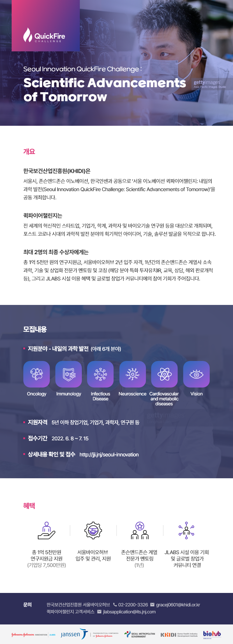 한국보건산업진흥원, 서울시, 존슨앤존슨 및 한국얀센이 '서울 이노베이션 퀵파이어 챌린지(Seoul Innovation QuickFire Challenge)'를 공동 개최한다.