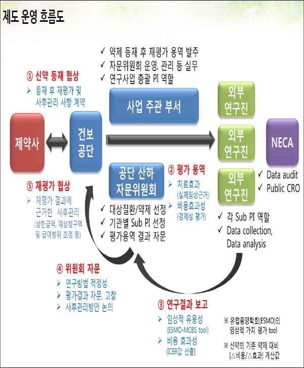 제약사와 건보공단이 등재협상에서 재평가와 사후관리와 관련한 사항을 계약에 반영하고, 이후 건보공단 사업주관부서가 연구사업 총괄 PI를 맡아 외부연구진에 평가용역을 발주한 뒤, 그 결과를 토대로 재평가 협상을 진행하는 방식이다.