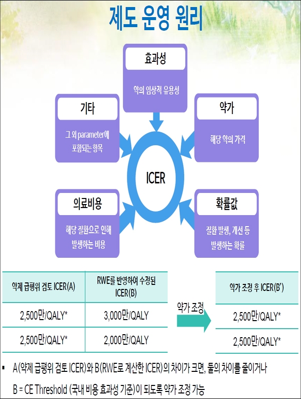 안 교수는 가격 조정방식을 두 가지로 제안했다. 우선 심사평가원 약평위 ICER과 RWE로 산출된 ICER 차이가 클 경우 격차를 줄인다. 가령 약평위 ICER는 '퀄리(QALY)' 당 2500만원, RWE ICER은 3000만원이거나 약평위 2500만원, RWE 2000만원인 경우 각각 ICER이 2500만원이 되도록 약가를 조정한다. 가격을 낮추기만 하는 게 아니라 인상할 수도 있다는 의미다.