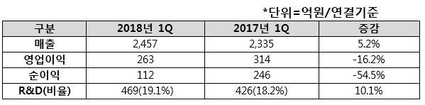 한미약품(대표이사 우종수·권세창)은 2018년 1분기 연결회계 기준으로 매출 2,457억원을 기록하며 5%대 성장률을 달성했으며, R&D에는 매출의 19.1%에 해당하는 469억원을 투자했다고 2일 잠정 공시했다.
