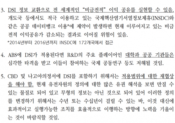 반면, 해외 선진국에서는 DSI가 나고야의정서에 포함되는 것에 대해 혁신과 이용을 저해해 궁극적으로 생물유전자원 제공국과의 이익공유도 제한할 것이라며 반대하고 있다. 지난 7월, 국제 단체와 지역·국가별 기관 등 58개 단체에서도 공동으로 성명서를 발표하고 우려를 표하고 있는 상황이다.