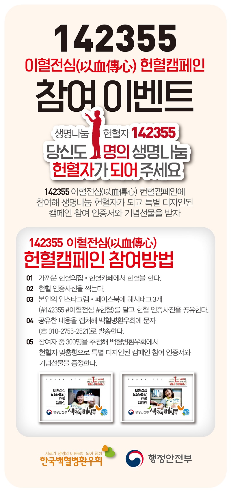 환우회는 캠페인 참여 독려를 위해 '목표한 14만 2355명 중 1명의 생명나눔 헌혈자가 된 사람이 헌혈의집·헌혈카페에서 헌혈 인증사진을 찍어 본인의 인스타그램·페이스북에 해시태그 3개(#142355 #이혈전심 #헌혈>를 달고 헌혈 인증사진을 공유한 후 공유한 내용을 캡처해 백혈병환우회에 문자로 발송하면 참여자 중 300명을 추첨해 헌혈자 맞춤형으로 특별 디자인된 캠페인 참여 인증서와 특별선물을 증정하는 이벤트'를 7월 12일부터 8월 31일 동안 50일 동안 진행한다.