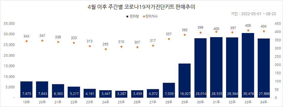 자가키트는 7월과 8월 재유행을 기점으로 3000여 개에서 30주 2만8000여개로 급증했다. 지난 주인 34주차 판매량은 2만7886개로 이전 주보다 2000 여개 감소한 것으로 집계됐다. 15일 광복절 약국 대부분이 휴무였던 점이 영향을 미친 것으로 보인다.