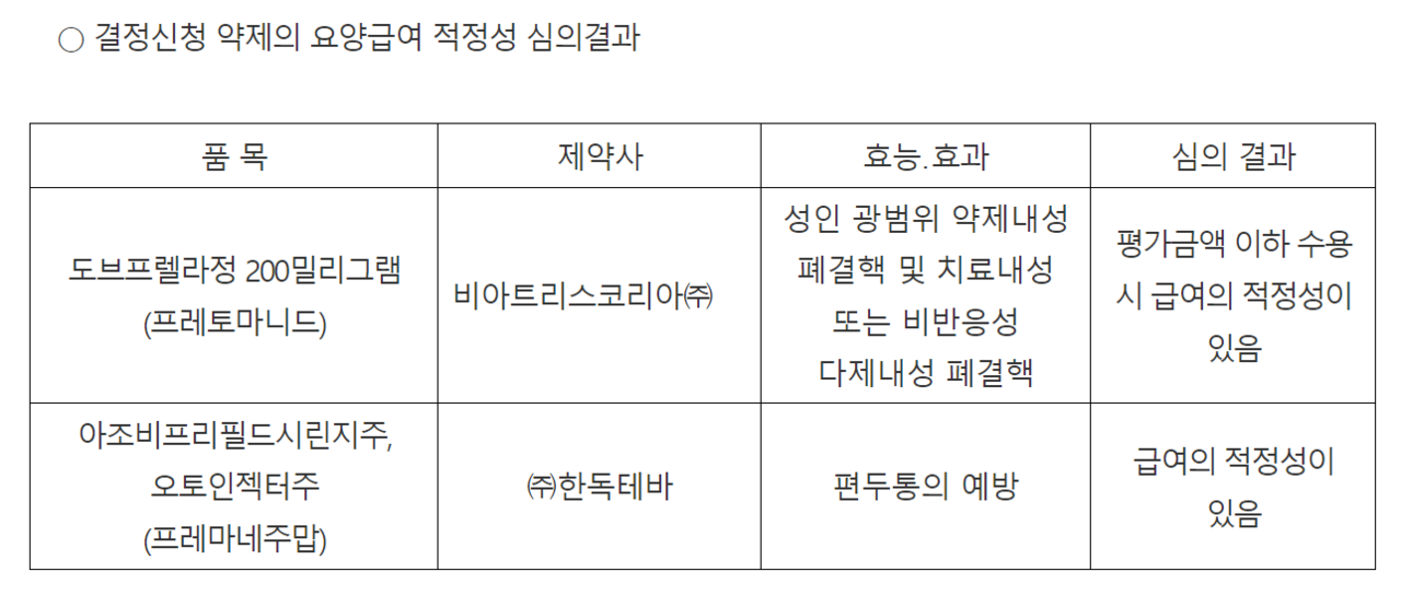 반면 비아트리스코리아 다제내성 폐결핵 치료제인 도브프렐라(성분 프레토마니드)는 평가 금액 이하를 수용해야 하는 조건부로 급여 적정성을 인정받았다.