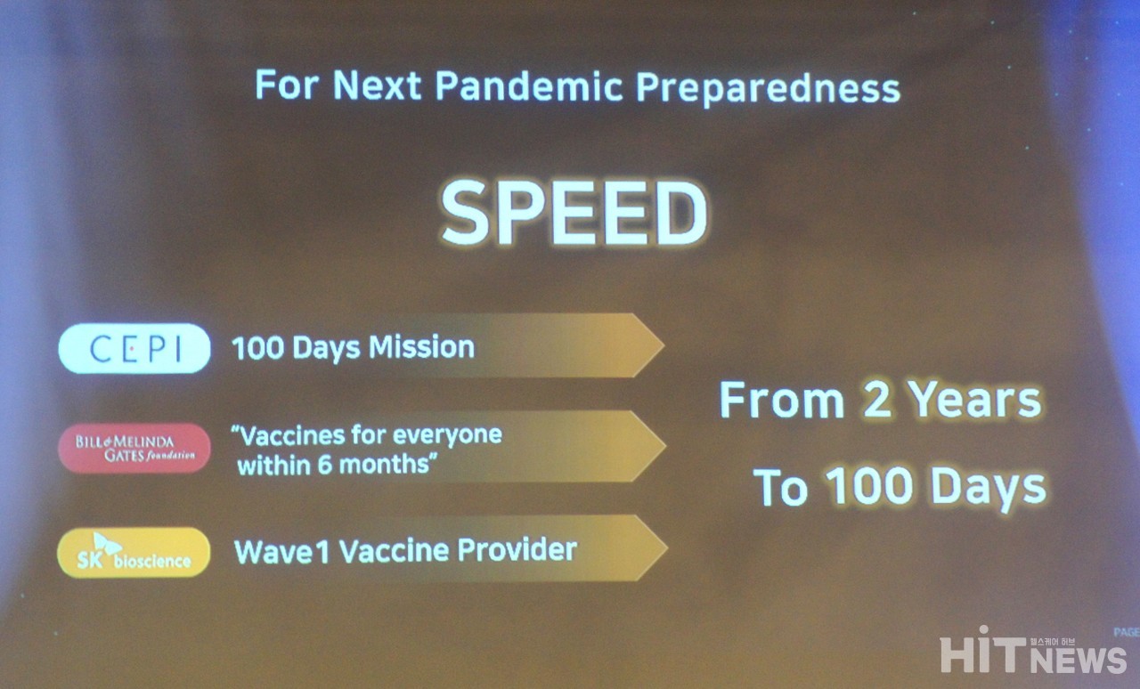 이번 경험을 바탕으로 넥스트 팬데믹 대응을 위한 수많은 시사점이 있지만, 가장 중요한 한 가지만 말씀을 드리면 스피드라고 말씀드리겠습니다. CEPI에서는 100일 안에 백신 개발, 게이츠 재단에서는 6개월 안에 전 세계 사람들에게 공평한 백신을 접종받는 걸 목표로 하고 있습니다. 그리고 저희 SK바이오사이언스에서는 웨이브1 백신을 생산 공급하려합니다. 그렇다면 저희에게 주어진 메시지는 아주 심플합니다.