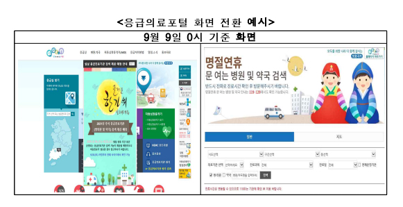 9일 0시 기준 응급의료포털 접속 시 명절 전용 화면으로 전환되며, 별도 알림창으로 문을 연 병·의원, 약국, 선별진료소 및 임시선별검사소, 원스톱진료기관 등 정보도 확인이 가능하다.