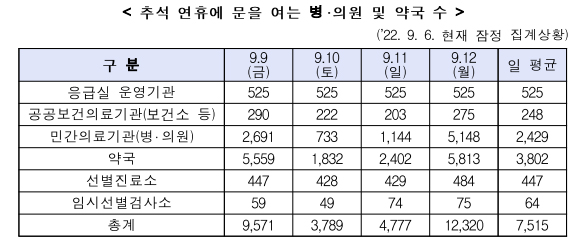 응급환자를 위하여 응급실 운영기관 525개소는 평소와 동일하게 24시간 진료하며, 다수의 민간의료기관이 문을 닫는 추석 당일(9.10.)에도 보건소를 비롯한 일부 공공보건의료기관은 진료를 계속한다.
