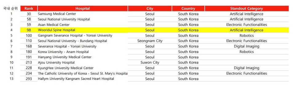 올해 2회째 발표된 스마트 병원에는 병원 시스템의 전산 능력(Electronic functionalities), 원격 의료(Telemedicine), 디지털 영상(Digital Imaging), 인공 지능(AI), 의료 로봇(Robotics) 등 5개 항목을 기준으로 전세계 28개국 300개 병원을 선별해 발표했는데, 우리들병원은 300개 병원 중 98위를 기록했다.