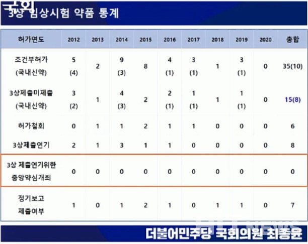 최종윤 의원에 따르면, 지난 10년간 조건부허가를 획득한 허가품목 35개 중 허가 후 3년이 지나도 임상시험 결과를 미제출한 품목은 15개에 달했으며, 이중 국산신약은 10품목이나 8개 임상 3상 결과가 제출되지 않았다.