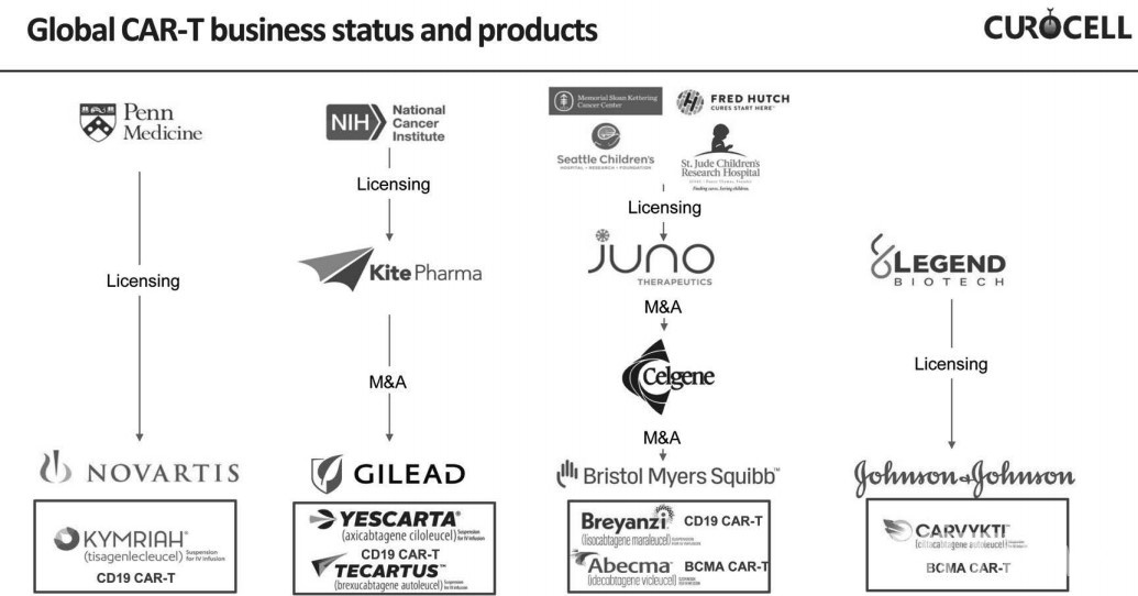 현재 출시된 CAR-T 치료제는 △2017년 킴리아(노바티스) △2017년 예스카타, 2020년 테카투스(길리아드) △2021년 브레얀지, 아벡마(BMS) △2022년 카빅티(존슨앤존슨) 등 6품목이다. 이 제품들은 모두 기술이전 또는 M&A를 통해 글로벌 제약사들이 도입해 생산, 공급하고 있다.