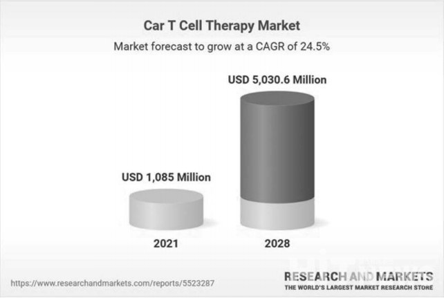 글로벌 시장조사기관 RESEARCHANDMARKET에 따르면, 2021년 글로벌 CAR-T 시장규모는 10억 8500만 달러(약 1조 5700억원)으로 나타났다. 이 시장은 24.5%의 연평균 성장률을 보이고 있으며, 2028년에는 50억 3100만 달러(약 7조 2600억원) 규모가 될 것으로 전망된다.