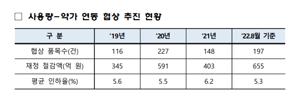 복지부에 따르면 사용량-약가연동 협상으로 2019년 345억원의 재정이 절감됐고 2020년 591억원, 2021년 403억원, 올해 8월 기준 655억원이 재정 절감효과를 거뒀다. 협상 약제의 최대 인하 범위가 10% 이내다.