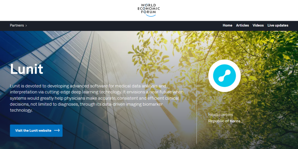 다보스포럼에는 지금까지 구글, 마이크로소프트, JP모건 등 글로벌 기업과 현대자동차, SK, GS, LG화학, KT와 같은 국내 굴지의 기업들이 참석하고 있다. 루닛은 지난 2020년 세계경제포럼이 유망한 초기 스타트업을 선별하는 '테크놀로지 파이오니어(Technology Pioneers)'에 한국 기업으로는 유일하게 선정된 바 있다.