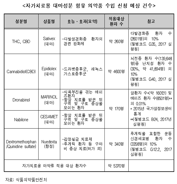 약제별 예상 환자수(건수)를 보면, 다발경화증 환자 경련완화제 사티벡스(대마) 약 260명, 드라벳증후군 등 치료제 에피디오렉스(대마) 약 4600명, 식욕부진을 겪은 에이즈 환자 등 마리놀(대마)과 항암치료를 받은 뒤 구역 및 구토 증상을 보이는 환자에게 쓰는 세사메트(대마) 등 약 170명, 감정실금치료제 등 누에덱스타(향정) 약 340명 등 총 약 5370명이다.