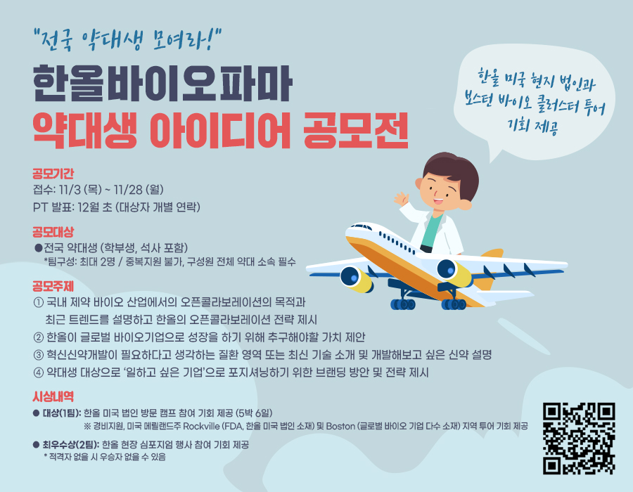 한올바이오파마(공동대표 박승국·정승원)은 오는 28일까지 미국 현지 법인 및 보스턴 바이오텍 클러스터 투어 기회를 제공하는 약대생 아이디어 공모전을 연다.