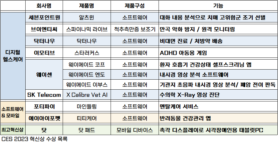 히트뉴스가 CES 2023 주최사인 CTA(Consumer Technology Association)가 발표한 2023 수상작 468개를 살펴본 바에 따르면, 디지털 헬스 부분 혁신상 수상작은 71건을 기록했으며, 이들 중 한국 제품은 8개로 스타트업 외에 SK Telecom과 같은 국내 대기업도 이름을 올리고 있는 것으로 확인됐다.