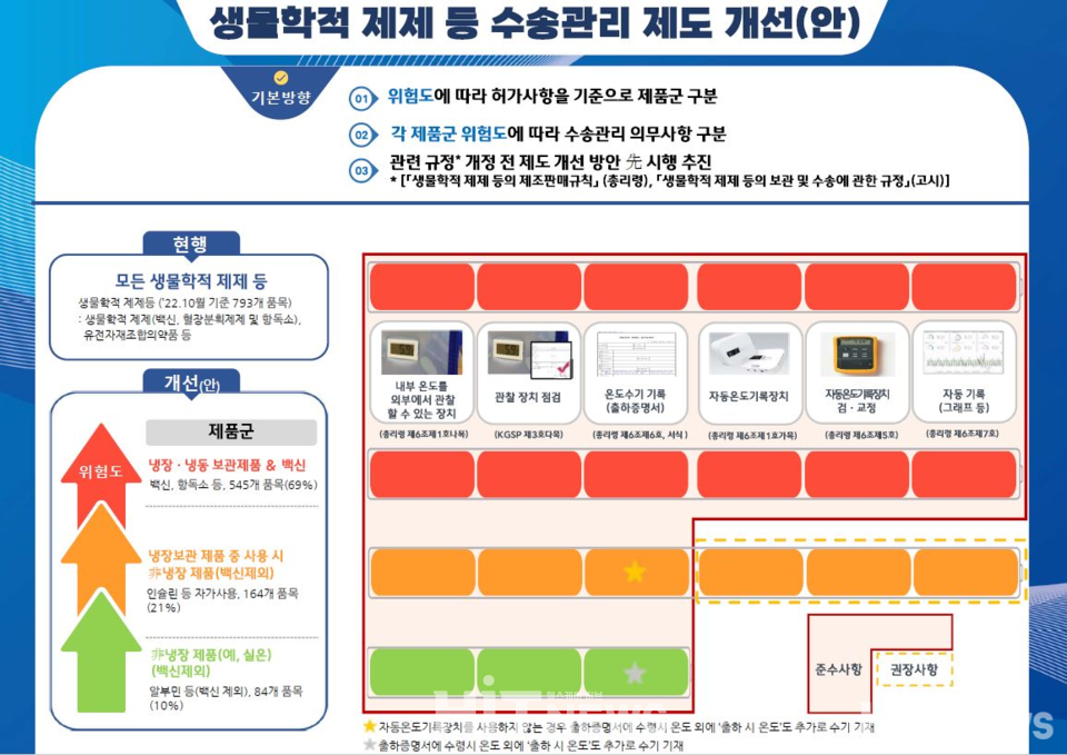 이에 따라 '생물학적제제 등(유전자재조합의약품 포함)' 793개 품목은 위험도가 높은 순으로 △냉장·냉동 보관제품, 백신(545개, 69%) △냉장보관 제품 중 사용 시 비냉장 제품(백신 제외)(164개, 21%) △비냉장 제품(백신 제외)(84개, 10%) 등 3개 제품군으로 구분해 각기 다른 조건에 따라 배송이 가능해졌다.