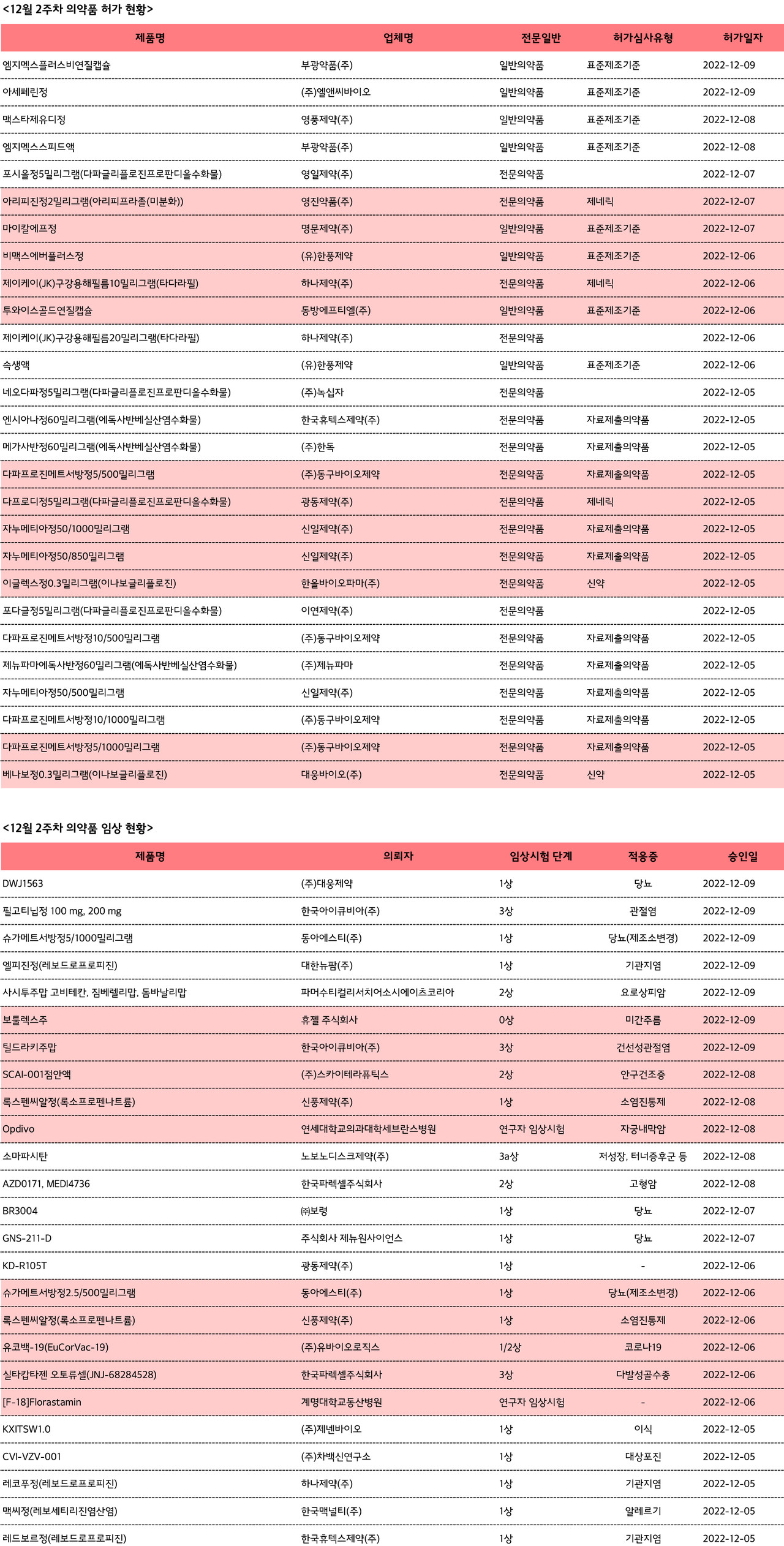 12월 두 번째 주 허가받은 의약품은 총 27건으로 전문의약품 19건, 일반의약품 8건이다.