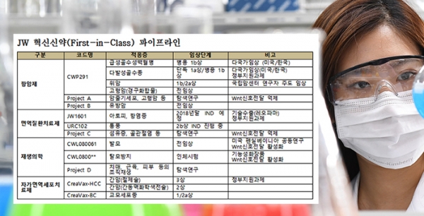 JW중외제약은 현재 Wnt표적항암제를 비롯해 아토피치료제, 탈모 등 재생치료제, 유방암치료제, 면역세포치료제 등 다양한 혁신신약 파이프라인을 보유하고 있다.