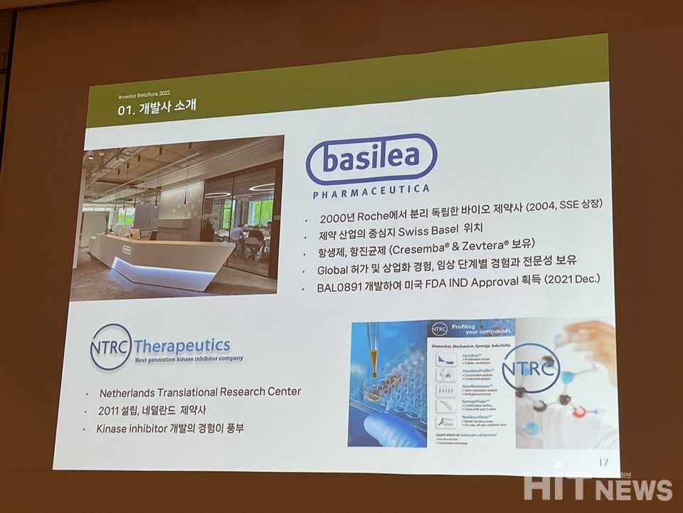 이재정 이사는 "BAL0891은 스위스 바실리아서 도입한 신약 후보물질로 저분자 화합물이다. 바실리아는 2000년 로슈(Roshe)에서 분리 독립한 기업"이라며 "BAL0891을 개발해 2021년 12월 미국 식품의약국(FDA) IND 승인을 획득했다"고 밝혔다. BAL0891은 SAC 조절효소 TTK와 PLK1의 저해제다.