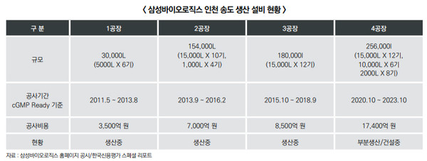삼성바이오로직스 성장의 역사는 ① 공장 건설과 ② 물량 확보 ③ 공장 건설의 선순환 궤도를 만들어 가는 과정이었다 해도 과언이 아니다. 공장을 지어 비즈니스를 하고, 비즈니스 성과에 따라 다시 공장을 짓는 과정이었다. 인천 송도에 자리잡은 1공장, 2공장, 3공장, 4공장(건설 중)까지 총 공사비용은 3조 6400억 원에 달한다.