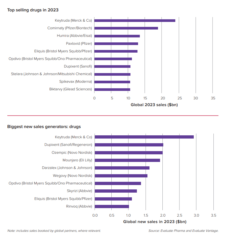 이어 화이자의 COVID 백신 '코미나티', 애브비의 자가면역질환 치료제 '휴미라', BMS·오노약품의 면역관문억제제 '옵디보' 순으로 매출이 많을 것으로 예상했습니다. 신규 매출을 추가할, 이른바 다크호스 품목으로 키트루다에 이어 사노피의 아토피 치료제 듀피젠트, 노보 노디스크 당뇨병 치료제 오젬픽, 릴리의 마운자로, 노보 노디스크 위고비 등 순으로 꼽혔습니다.