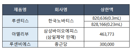 삼성 아멜리부주10mg(0.23ml)의 급여상한액은 46만 3773원이다. 종근당의 루센비에스주10mg의 가격은 그 보다 더 낮은 30만원이다.