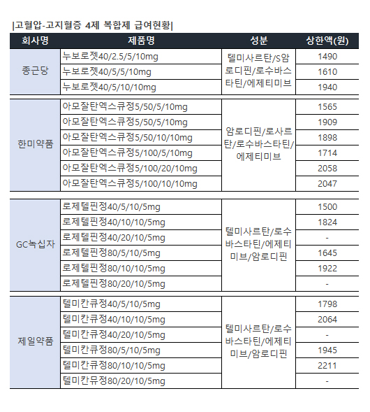 작년 2월 급여등재된 한미약품 아모잘탄엑스큐에 이어 올해 GC녹십자의 로제텔핀, 제일약품 텔미칸큐 등이 4제 복합제 시장에 뛰어들었다.
