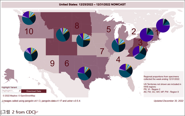 마지막 금요일인 30일에 발표한 CDD 그래프는 놀람 자체이다. 지난 주 두루뭉실하게 표시한 'XBB 변이'가 'XBB 1.5'라고 명시되었고 일주일 사이에 2배가 넘는 무려 40.5%이다. 더해서 'XBB 변이'도 3.7%이다. 이제 합이 44.2%로 미국은 'XBB 1.5' 변이 세상이 된 것이다[그림 1] 지역도 뉴욕, 보스턴을 포함하는 1, 2 지역의 Northeast는 무려 75%이다[그림 2].