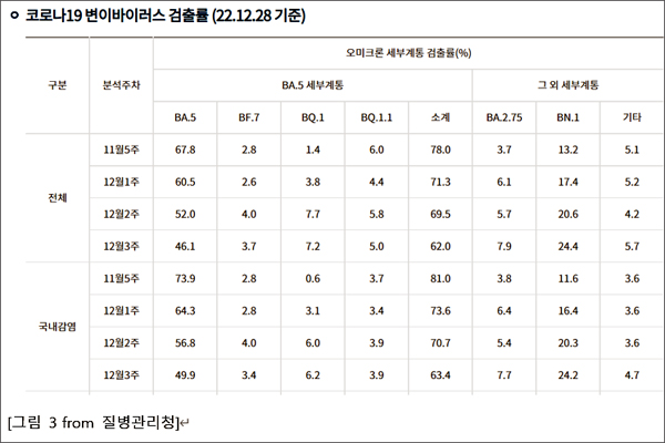 반면에 12월 3주 차의 '대한민국 코로나19 변이 검출률'은 BA.5가 46.1%로 아직도 주류를 이룬다. BQ.1.1과 BQ.1 합(合)이 12.2%이다. 12월 2주 차의 합과 거의 비슷하다[그림 3]. 아직 'XBB 1.5'를 못 검색한다고는 생각 안 하지만 명단남에는 2주 연속 없었다. 질병청이 미리 대비하는 전방위 방어가 필요하다. 그리고 좀더 많은 사람을 대상으로 변이 검출률이 보고되었으면 하는 바람이다.