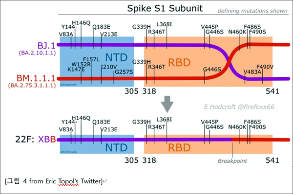 'XBB 변이'는 소위 켄타우로스 변이로 불린 BA.2.75와 BJ.1이 재조합되어 생긴 변이로 인도와 싱가포르 등 아시아에서 이미 우점종인 상태이다[그림 4]. 반면 미국과 유럽은 BQ.1, BQ.1.1이 우점종이다. 아시아는 XBB, 서양은 BQ로 양분된 상태였다. 현재 싱가포르는 오히려 XBB 점유율이 낮아지고 BQ가 높아지고 있는데 반면에 미국에서는 XBB의 현 세대인 'XBB.1.5'가 BQ를 대체하고 있다는 판단이다.