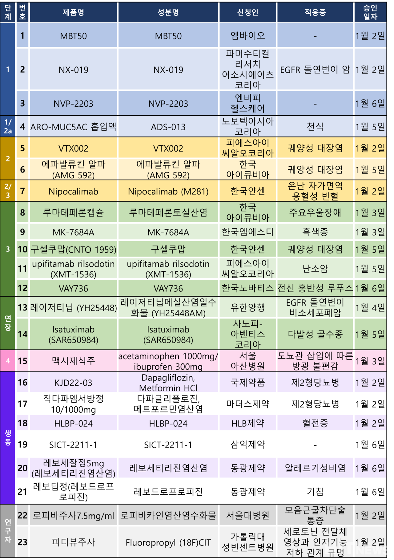 지난주 임상시험계획은 총 23건이 승인 완료됐다. 세부적으로 △1상 3건 △1/2a상 1건 △2상 2건 △2/3상 1건 △3상 5건 △연장 2건 △4상 1건 △생물학적동등성 6건 △연구자임상 2건 등이다.