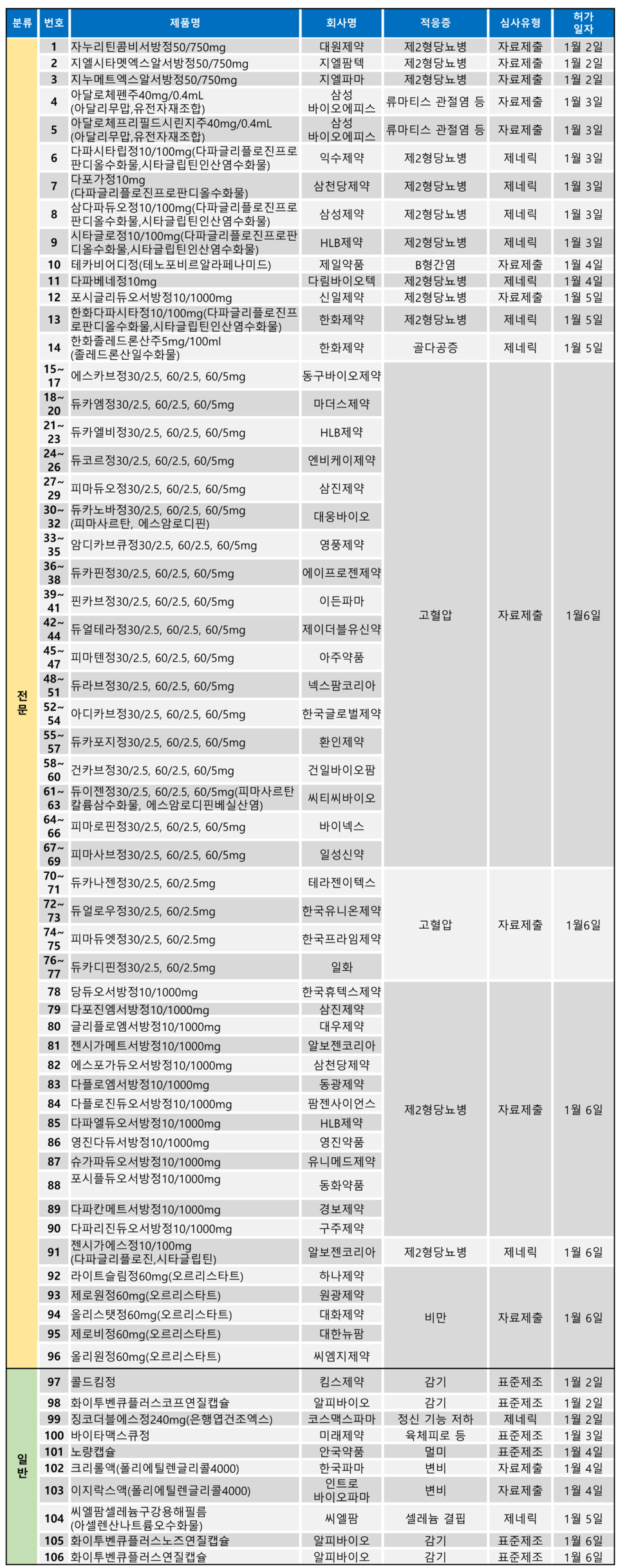 지난 주(1월 2일~1월 7일)에는 총 106개 품목이 식품의약품안전처로부터 품목허가를 받았다. 이 중 전문의약품은 96건, 일반의약품은 10건이었다.