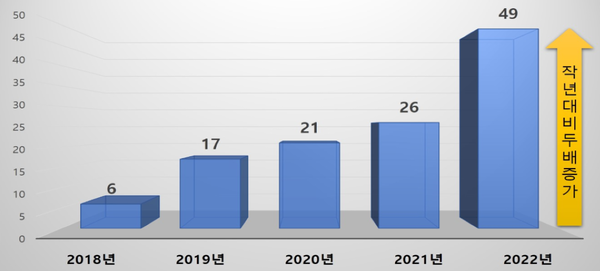 13일 식약처 발표에 따르면, 소프트웨어 의료기기 임상시험계획 승인 건수는 지난 2018년 6건을 시작으로 지난해 49건까지 큰 폭으로 증가했다.
