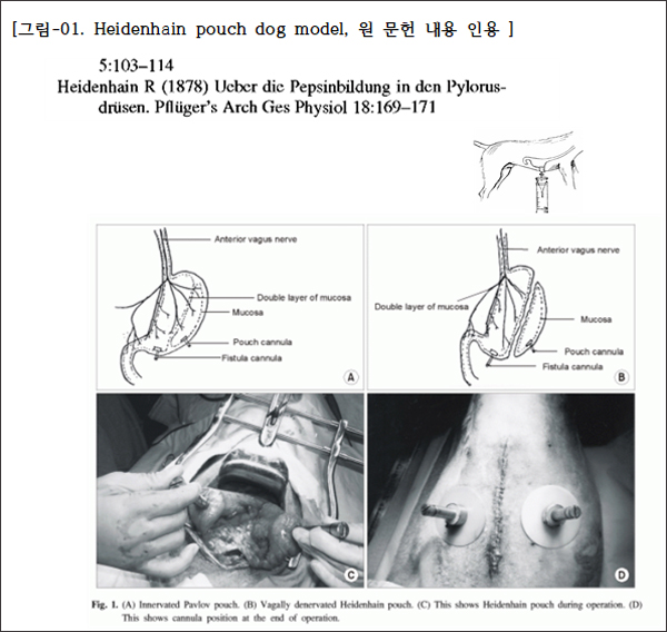 Heidenhain pouch dog model의 개요를 간단하게 정리하자면, 실험동물인 beagle dog을 마취하에 수술하여 위강을 두 개의 주머니(pouch)로 분리하고, 한 주머니에서는 식도로부터 들어오는 사료가 통과할 때 위산이 분비되어 정상적인 소화활동을 받은 다음 pylorus를 통하여 십이지장으로 이송되게 하고, 다른 한 주머니는 폐쇄상태로서 사료가 다른 주머니를 통과할 때, 폐쇄상태의 주머니에서도 위산이 분비되므로, 분비된 위산을 cannula를 통하여 체외로 배출하여 분비액의 산도와 부피를 측정함으로서, 위산분비 정도를 평가하는 동물모델이다. (그림-01 참조) 실제로 위산분비 차단효능 시험에서는 사료섭취에 의한 위산분비를 유도하지 않고, histamine solutiion을 정맥내 infusion 투여하여 위산분비를 유도하면서, 시험약물의 위산분비 억제작용을 측정한다.