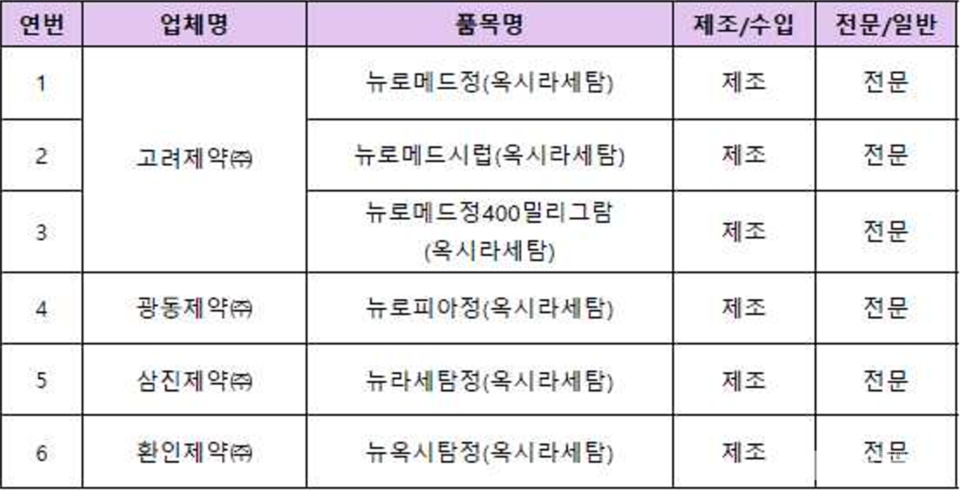 이번 조치 대상은 △뉴로메드정(고려제약) △뉴로메드시럽(고려제약) △뉴로메드정400밀리그람(고려제약) △뉴로피아정(광동제약) △뉴라세탐정(삼진제약) △뉴옥시탐정(환인제약) 등 6품목입니다.