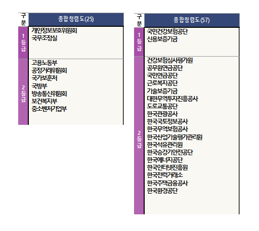 공직유관단체에 속하는 국민건강보험공단은 종합청렴도 1등급, 건강보험심사평가원은 2등급을 받았다.