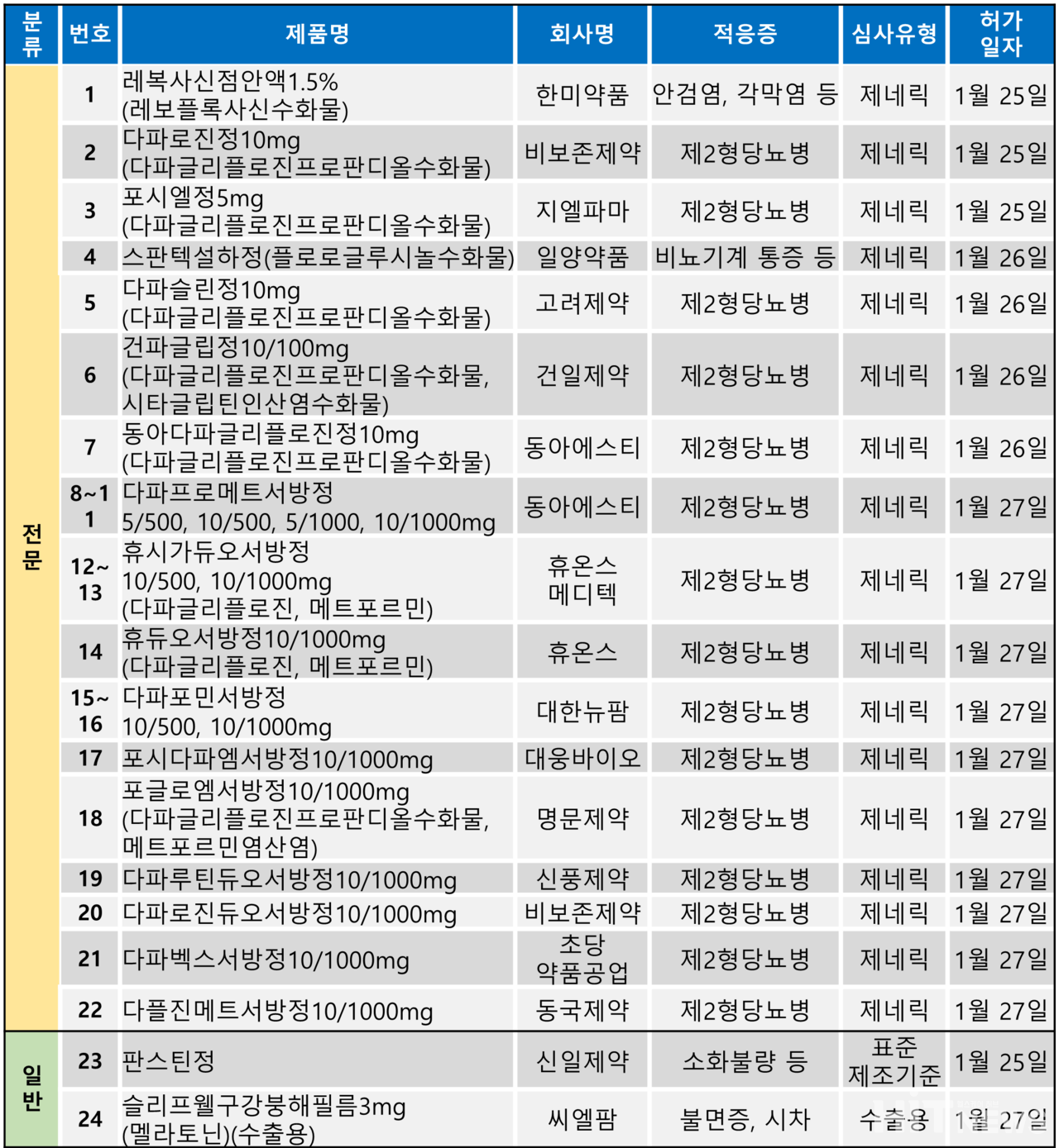 이번 주 허가 전문의약품은 전부 제네릭이었으며, 그 중 22개(91%)가 포시가와 직듀오서방정 후발약이었다.