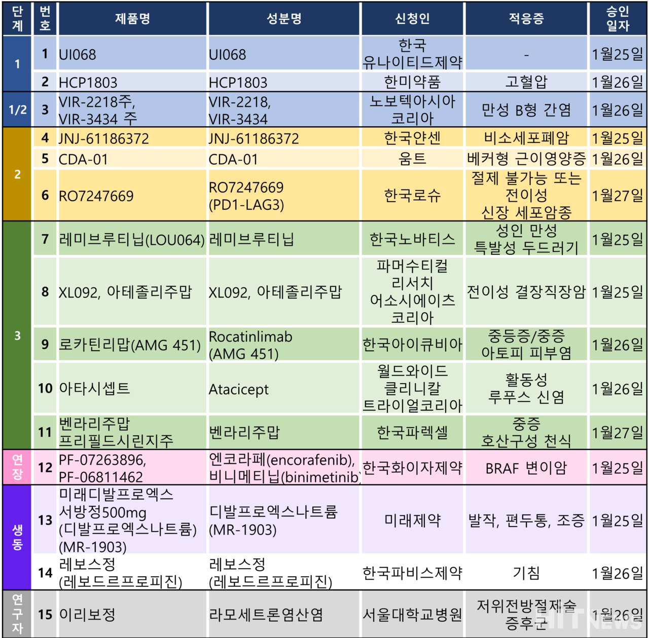 이 임상시험들은 고혈압, 만성B형간염, 활동성 루푸스 신염, 아토피 피부염 및 BRAF 변이암, 결장직장암, 비소세포폐암, 신장암 등 다양한 암종에 대해 승인됐다.